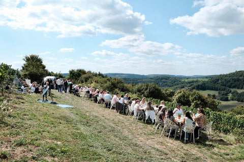 Am Hoffest wandern alle zusammen zum Sektfrühstück in den Weinberg.